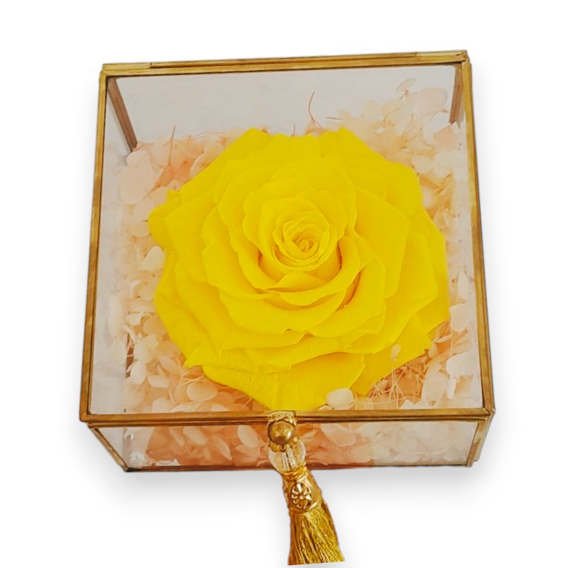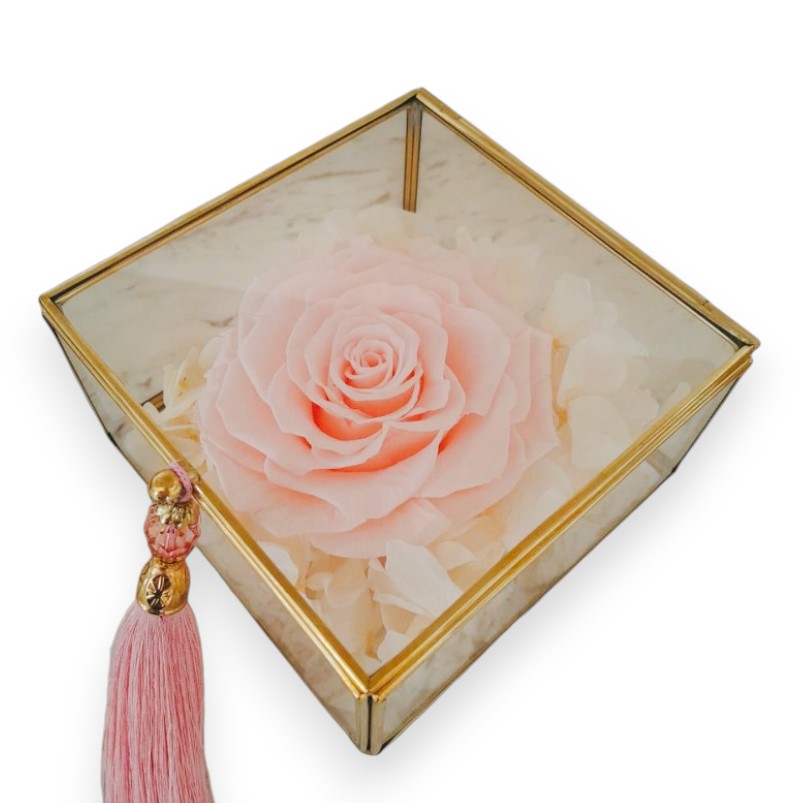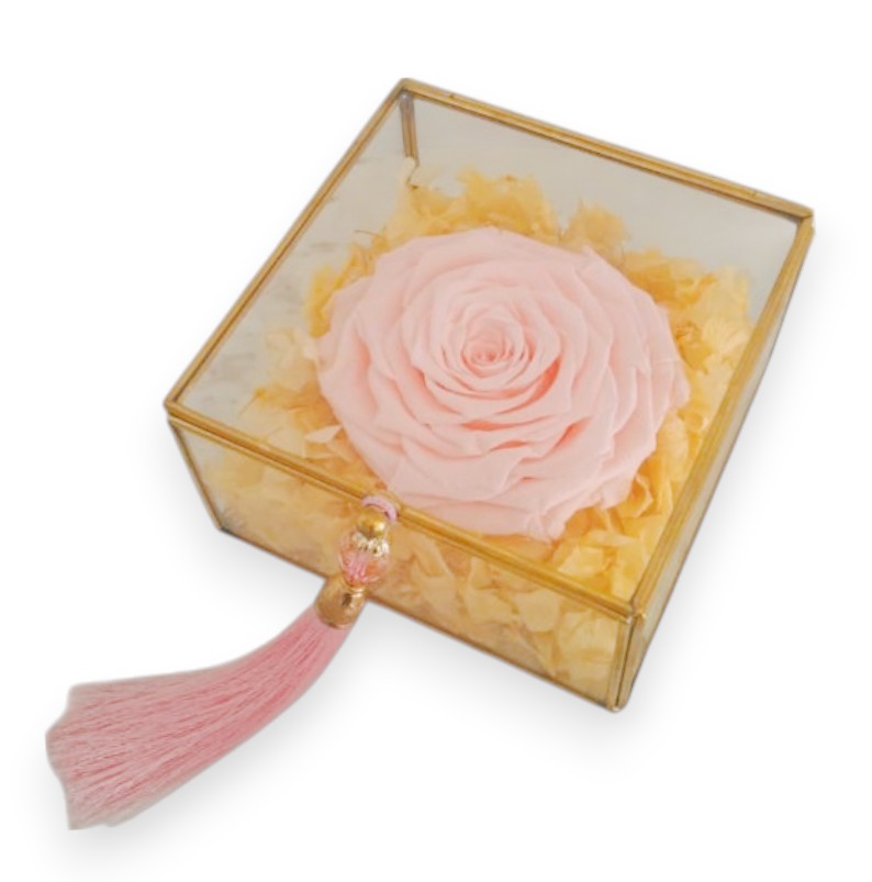 Exprese sus emociones más genuinas y profundas con rosas tan exclusivas como elegantes. La presentación de la Caja de Cristal, con su diseño que evoca una moderna espiritualidad, fascina a todo aquel que la contempla. Más allá de su belleza protectora, contribuye a prolongar la delicada fragancia de la rosa, infundiendo cada instante con un aura de magia adicional.