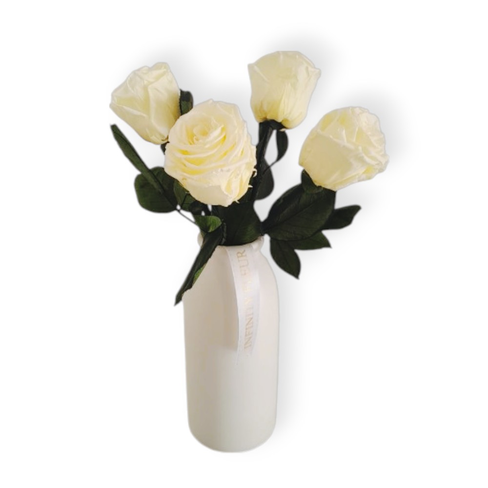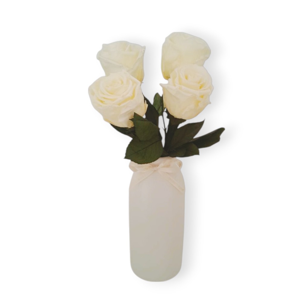 Adéntrate en un universo de encanto inigualable con nuestro Jarrón IF, transformando tu hogar en un jardín donde las flores eternas florecen eternamente. Este exquisito arreglo, dispuesto con maestría en una elegante base de barro blanco con 32 cm de alto junto las flores, presenta 4 rosas eternas, cada una con sus tallos de 15 cm naturales cuidadosamente preservados. Es una obra de arte floral que promete una belleza sin fin.