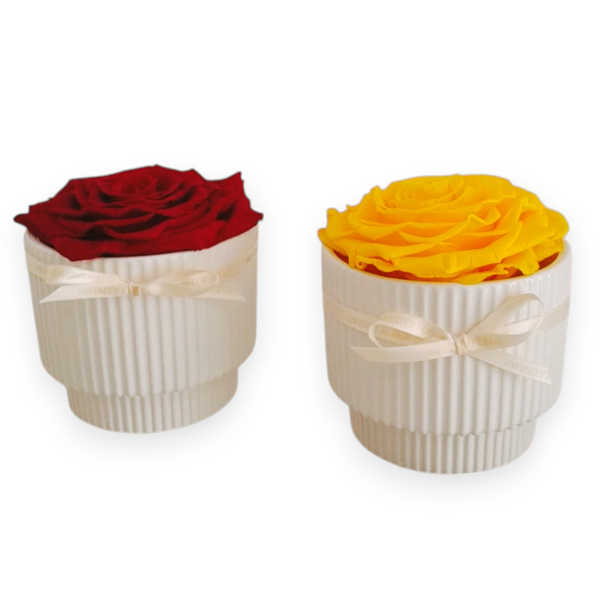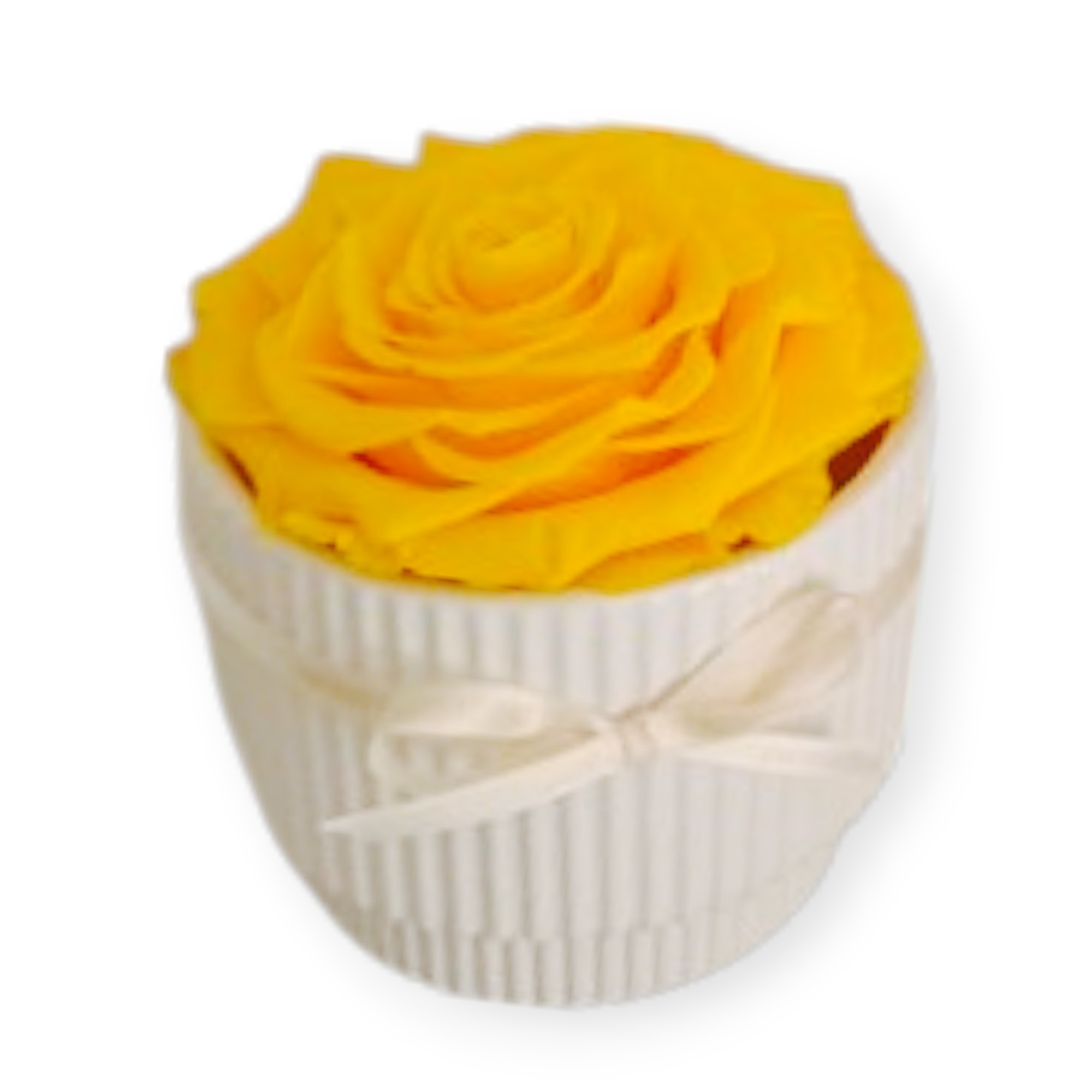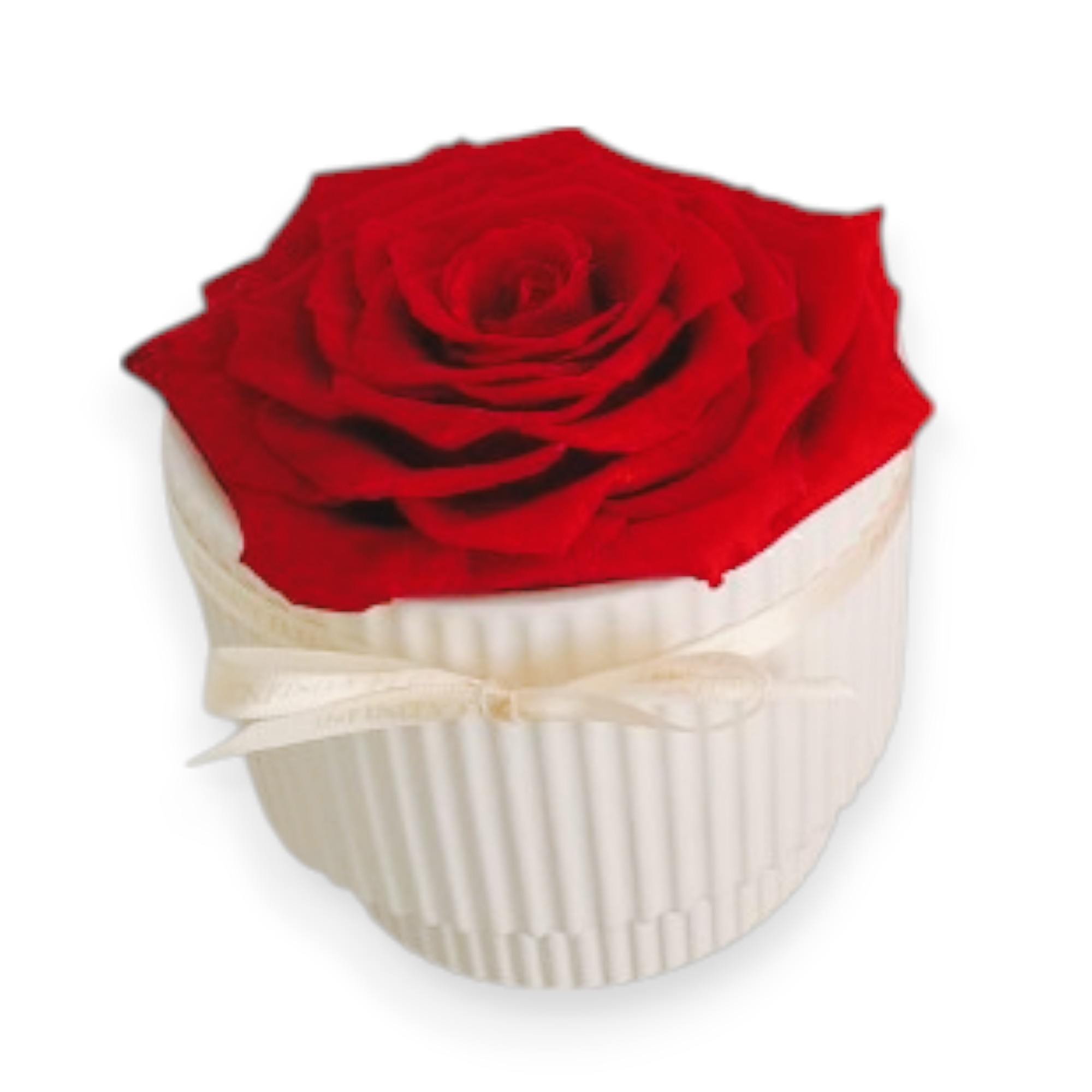 Descubra la distinción sin esfuerzo con nuestra Maceta de Cerámica Blanca, un testimonio de belleza y sofisticación duradera. Este exquisito arreglo presenta 1 rosa Queen exclusiva, preservada con maestría para conservar su frescura y esplendor por más de seis meses.