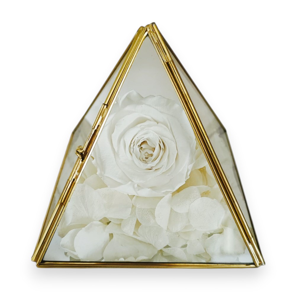 Dentro de cada pirámide de cristal, yace una única rosa preservada descansando sobre una delicada cama de hortensias, elegida por su impecable belleza y su capacidad de mantener su esplendor. Esta flor eterna se convierte en el corazón de un misterio que reside en su interior, un símbolo sutil y conmovedor que acompaña a sus seres queridos en todo momento. Es un recordatorio de que, incluso en la pérdida, la belleza y el significado profundo persisten.